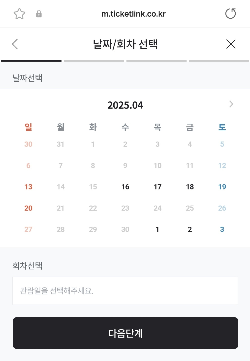 원하는 일정과 자리를 선택하면 되는데, 위와같이 자리 부분에 색상이 들어오지않고