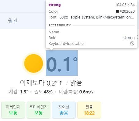 위 사진은 현재 서울기준 네이버 날씨이며, 포커싱 된 부분의 글자를 추출하여 기기 화면으로 가져오는 코드를 Jsoup 라이브러리를 통하여 작성해보겠습니다.
