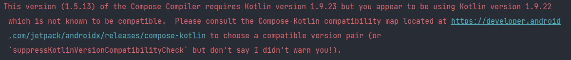 Compatible Kotlin Version -> 1.9.22 를 사용 하지만 Compose Compiler Version -> 1.5.13 으로 맞춰주고 있음으로 발생하는 에러이다.