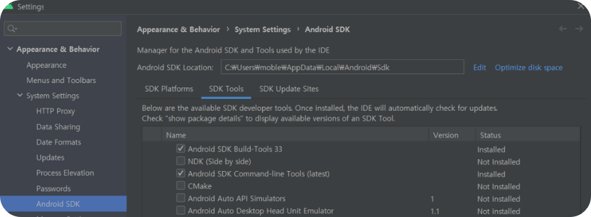 - android studio SDK 설정(Tool - SDK Manager - Settings - SDK Tools —> Android SDK Command-line Tools (latest) 체크)