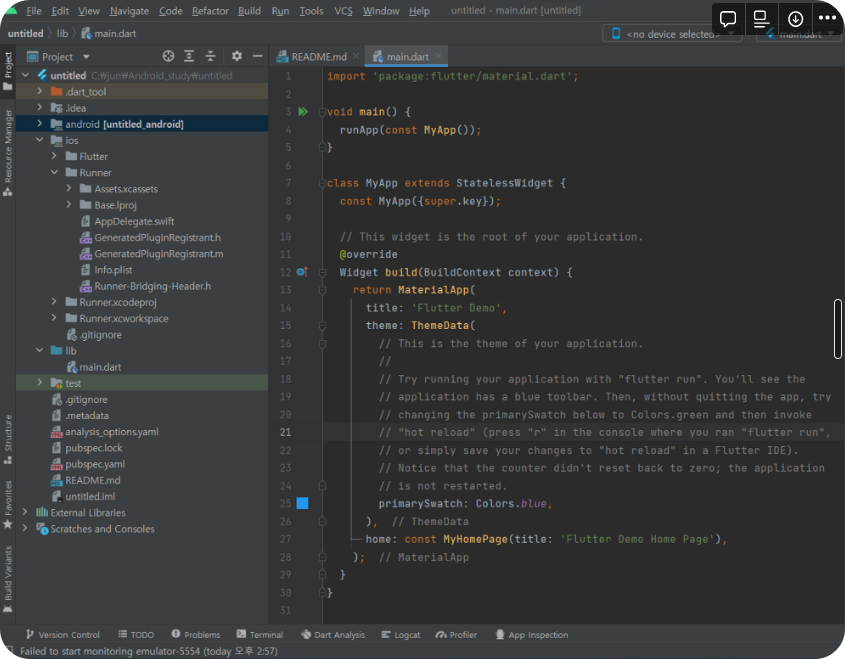 android studio에서 new flutter project 생성.