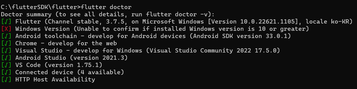 - flutter폴더로 이동후 flutter doctor 입력.