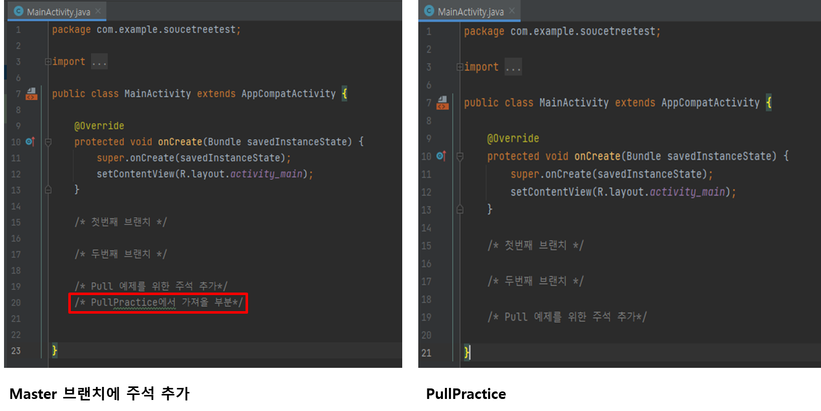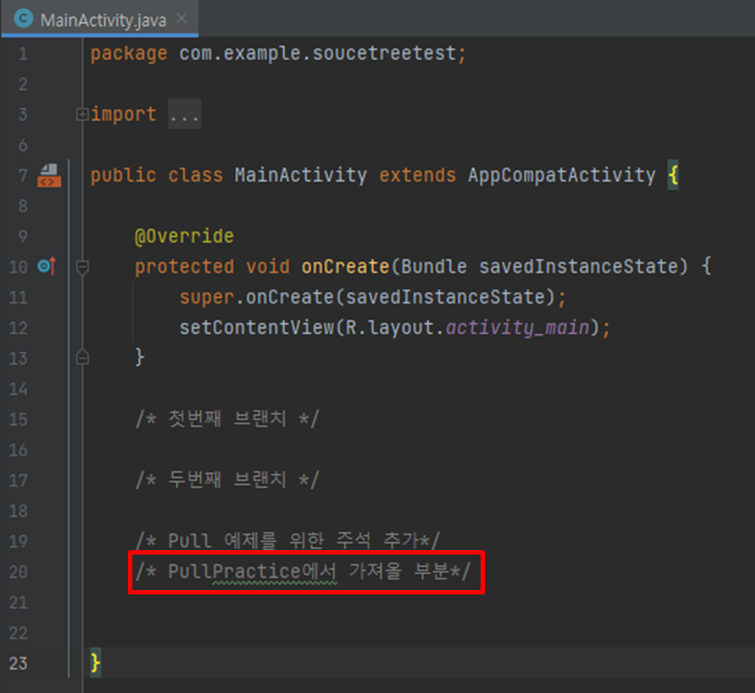 PullPractice 파일에 가져올 주석 부분을 Master 브랜치에 추가를 하고, commit & push를 진행하여 줍니다.