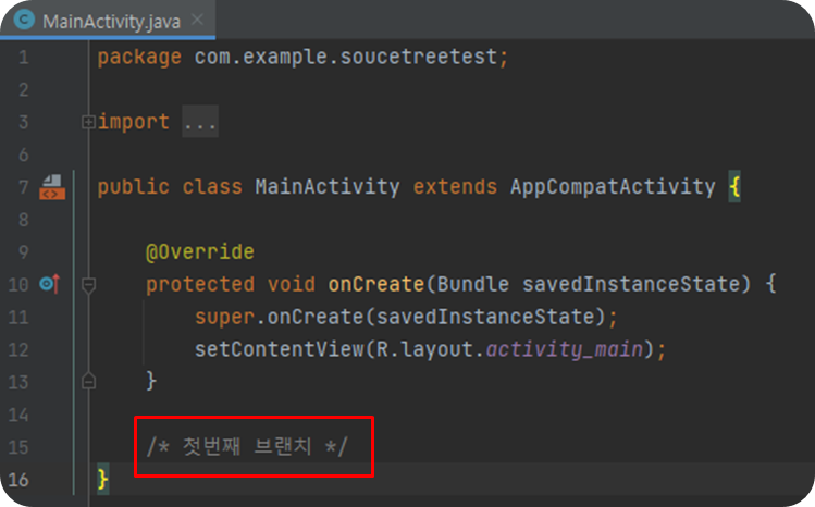 병합 테스트를 위해 FirstBranch에 '첫번째 브랜치' 라는 주석을 추가하고 commit / push를 진행합니다.