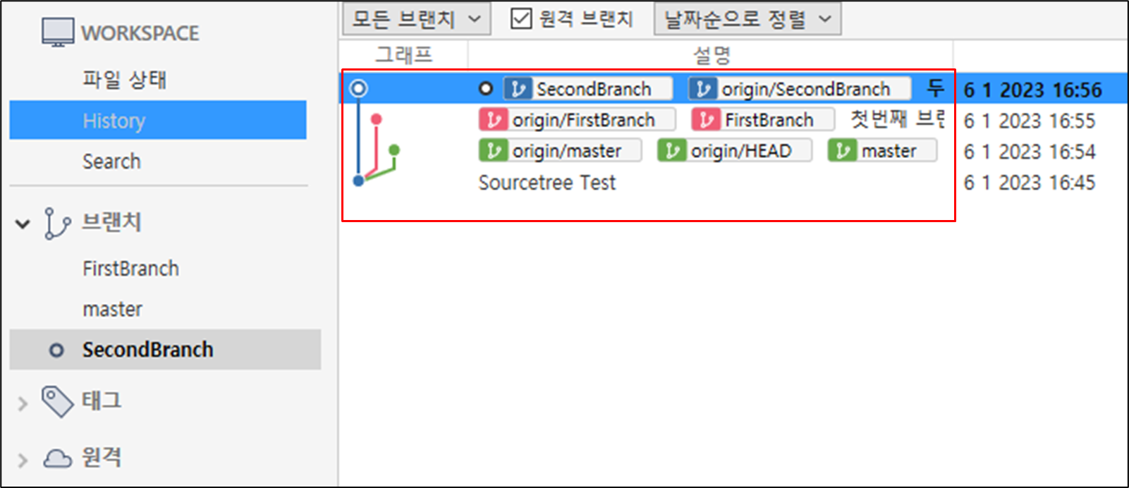 master브랜치 위아래로 방금 생성한 브랜치(FirstBranch & SecondBranch)를 확인할 수 있습니다.