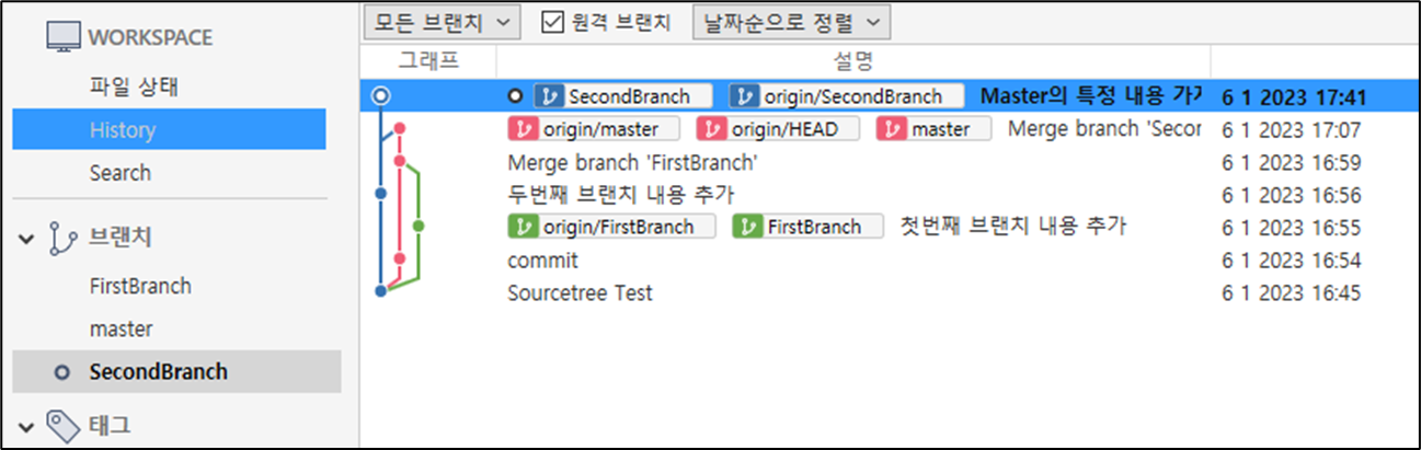 https://a070415.tistory.com/21 [Git] 소스트리(Sourcetree) 병합(Merge) Merge -> 다른 브랜치의 내용을 현재 check out된 브랜치에 병합하는 것. FirstBranch에 '첫번째 브랜치' 라는 주석 추가 Merge 후 Push 첫번째 브랜