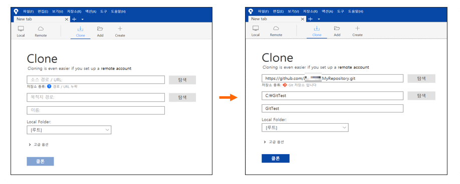- 목적지 경로 : 지역저장소에 저장할 위치(GitTest)