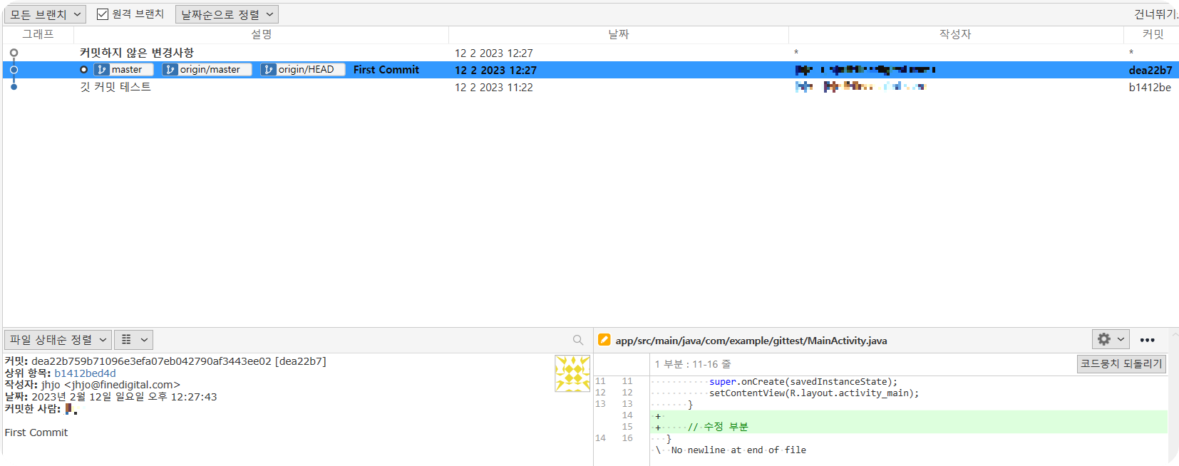 저장소에 반영된 모습이며, 우측 하단에 변경사항에 대한 코드를 보여주는 것을 확인 하실 수 있습니다.