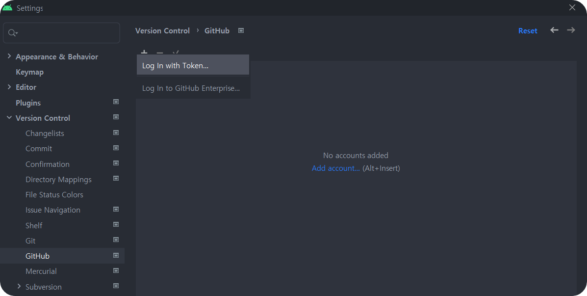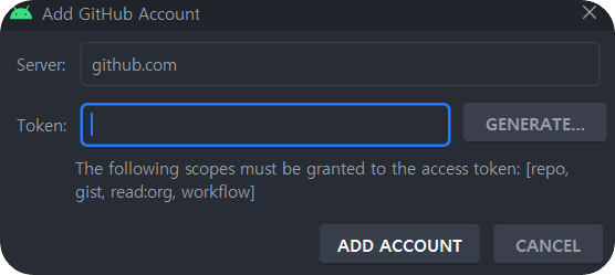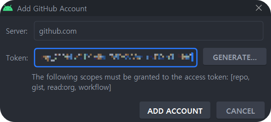 발급받은 토큰을 복사하여 Add GitHub Account 창에 입력 후 ADD ACOUNT 클릭