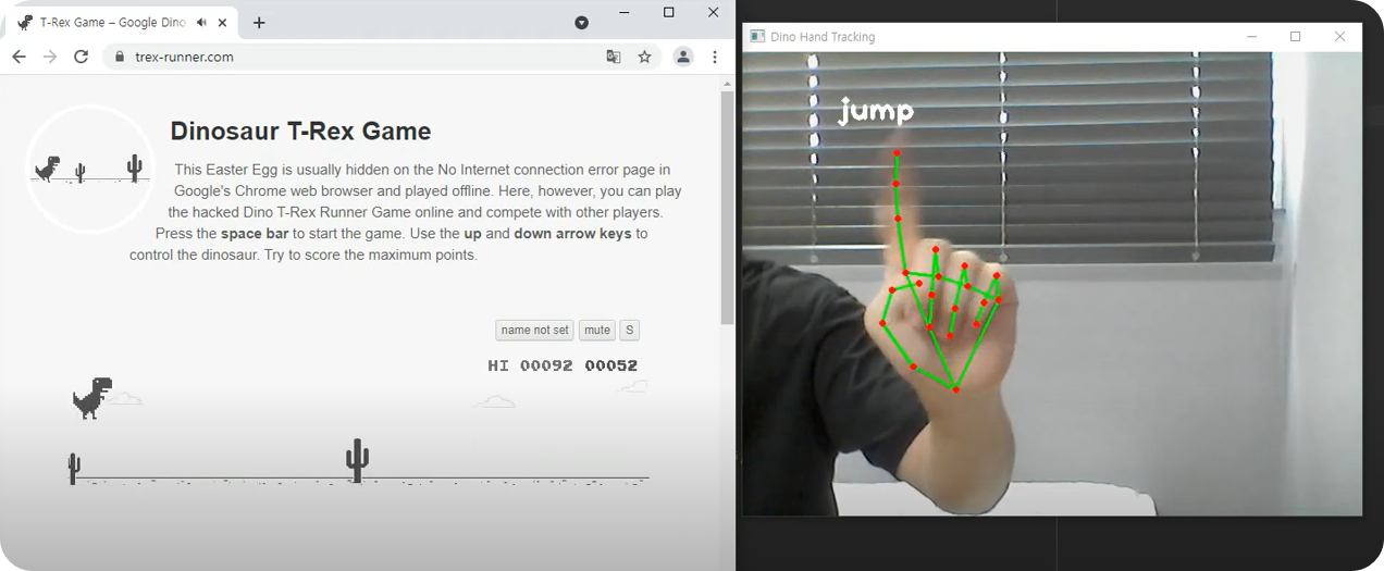 해당 프로젝트는 Mediapipe 라이브러리를 사용하여 손을 인식 시키고, 손가락 위치에 따른 키보드 제어를 통해 Google Trex게임을 다루어보았습니다.